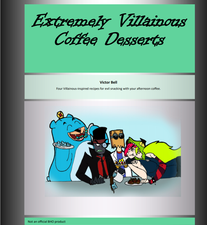 A small booklet of four sweet coffee dessert recipes inspired by the main cast of Villainous.